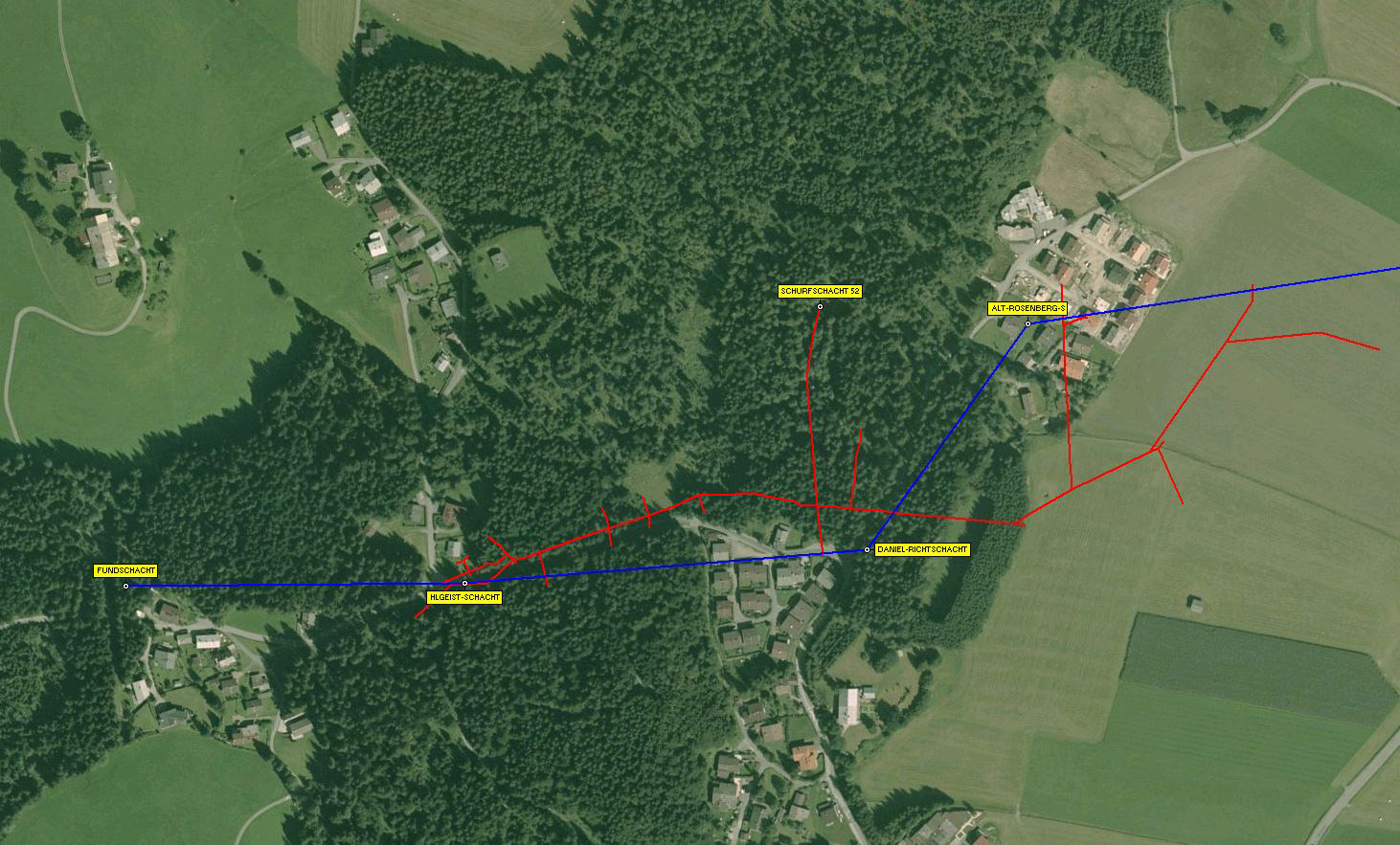Die rote Linie stellt die Stollen von 1952 - 1955 dar. Die blaue Linie die Erzlinie nach Karte von 1786.