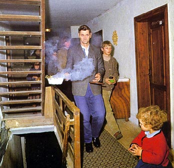 Bauer mit der Räucherpfanne, zusammen mit der ganzen Familie, betend