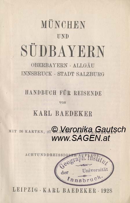 BAEDEKER Karl, München und Südbayern. Oberbayern, Allgäu, Innsbruck, Stadt Salzburg. Handbuch für Reisende. Mit 26 Karten, 27 Plänen und 3 Panoramen, Leipzig 1928. (38. Aufl.)