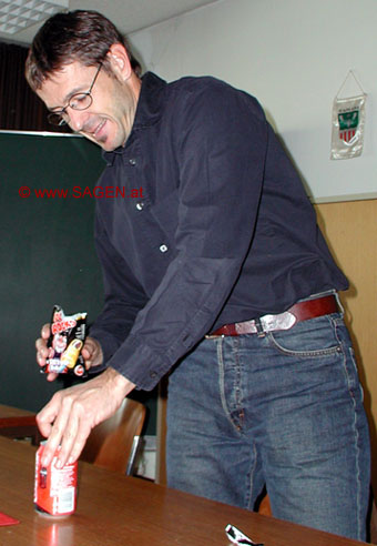 During his lecture "Contemporary Legends" on October 16, 2002 A.o. Prof. Dr. Ingo Schneider was persuaded by the author of this website to carry out an experiment on himself in front of the assembled audience: