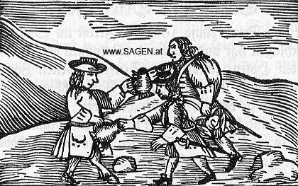 Auf eine Zeit bekamen zwei Messerschmiede-Gesellen in Schmiedeberg ihren Abschied, und noch eher, als sie es vermutet, resolvierten also miteinander, in Meißen übers Gebürge [Gebirge] zu reisen. Wie sie nun auf dem Kamm waren gegen die Kuppe und fast das Reisen satt hatten, dabei nicht geglaubet, vom Wirtshause so weit entfernet zu sein, indem sie keines sehen konnten, wie sehr sie sich auch darnach umsahen, sichten sich also auf einen weit herum sehenden Hügel nieder und langeten aus ihrem Säckel herfür, was sie Gutes mitgenommen, und speiseten, wünschten dabei einen kühlen Trunk. Kaum hatten sie ihr Anliegen vergessen, so wurden sie einen Mann gewahr, der trug zween Krüge in Händen.