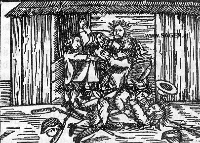 Es hatte vor etlichen Jahren ein unbescheidener Bauer auf den Rübezahl vielmal geschmälet, solchen bezahlte der beleidigte Geist auf folgende Art. Nämlich, wenn der Bauer mit seiner Drescherbursche in die Scheuren gegangen war, das Korn auszuschlagen, da konnte keiner die Flegelklöppel oder Bolzen niederschlagen, sondern sie blieben allzeit in der Höhe und schrieen Hundsfutt. Drüber einer den andern ansähe, und vermeineten, es täte ihnen einer unter ihnen diesen Schabernack; liefen bald zusammen, schmissen und prügelten sich erbärmlich ab, daß sie mehr Blutstropfen aus dem Leibe als Körnlein aus dem Strohe brachten. Immittelst schriee der Rübezahl noch immerfort sein Hundsfutt, und fing in Gestalt der Dreschflegel auf die Bauren loszuprügeln, daß sie wie die närrischen Ochsen aus der Scheuren liefen und froh waren, daß sie nur von den Flegeln erlöset worden: da sonsten im Widerspiele die Flegel lustig sein und triumphieren, daß sie aus ihrer Tribulierer Fäuste entrinnen.