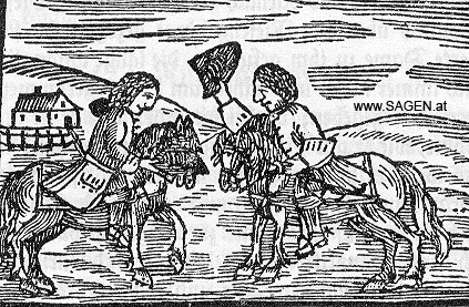 Es soll ein Rittmeister im schwedischen Krieg mit Fleiß aufs Gebürge [Gebirge] geritten sein mit seinem besten Pferde und Habite, hoffende, es werde sich Rübezahl ihm auch gütig erzeigen, also, daß er ein wackers Kleinod darvontrage. Und indem er in solchen Gedanken forttrabet, da war ihm ein wackerer Kavalier mit einem noch schönern Gaule und Kleidung entgegengekommen, darüber sich der Rittmeister gefreuet. Weiter war auch solcher ausgemundierter Rübezahl mit seiner Anrede nicht faul gewesen, sondern hatte flugs dem Rittmeister gefraget, sprechende: Glück zu, Bruder, woher? Haben wir nicht was umzusetzen mit Pferd und Kleide? Der Rittmeister hat geantwortet: Wohlan, ich komme aus Schlesien und will mich allhier ein wenig erlustieren; was des Herrn Bruders angebotenen Tausch belanget, so bin ick fertig umzusetzen. Und hiermit hat sich ein jeder ausgezogen, die Kleider und die Pferde verwechselt. Darmit ist Rübezahl abwegs anderswohin geritten; der Rittmeister aber war mit frohlockendem Mute wieder umgekehret und hatte nach seinem Quartiere zu getrachtet. Wie er aber kaum von der Schneeküppe wieder heruntergewesen, da war er inne geworden, daß er, anstatt die erhaltenen köstlichen Kleider, lauter Laub von den Bäumen umb sich gehabt, anstatt des Pferds aber hat er einen großen Prügel unter sich gehabt; darmit hatte er wie ein Halunke heremgefortisieret und hatte sich seines Tausches von Herzen geschämet, indem er auch einen Bauren umb bessere Lumpen, umb den Rump zu tun, hat anreden müssen.