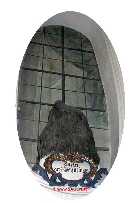 worauf das Fuhrwerk und seine Insassen verschont wurden. Als Andenken an diese wunderbare Rettung wurde ein Stück Felsens unter dem Titel "Stein des Gehorsams" in die Nische gesetzt, der größte Teil bildet heute ein Stück der Kirchenmauer unter der Kanzel.